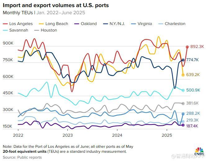 智通财经APP获悉,随着美国总统特朗普在贸易政策上的不断变化,洛杉矶港在6月迎来117年历史上最繁忙的一个月。据港口管理方数据,当月处理了892,340个标准箱(TEU)集装箱,远高于去年同期,增长约8%。这波运力上升并非单纯的经济增长所致,而是被港口高层称为“关税甩鞭效应(tariff whipsaw effect)”的结果,即企业赶在新关税生效前抢运商品入境,尤其是节日商品和消费品补货货物。