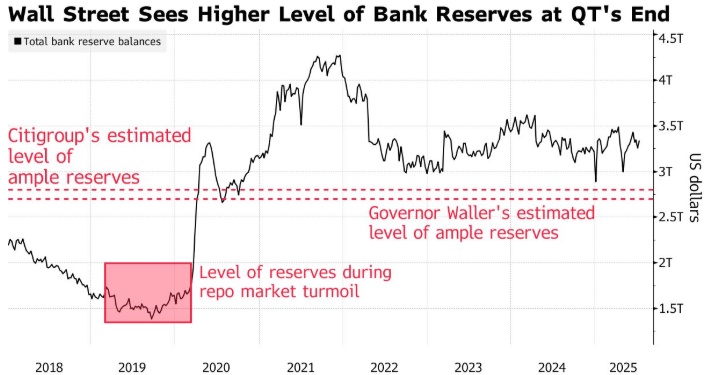 智通财经APP获悉,华尔街的策略分析师们认为,美联储理事沃勒对于金融系统中所需充足储备金以防止系统混乱的预测数值应该更高一些。沃勒上周表示,美联储可以将银行准备金降至约 2.7 万亿美元,而目前的水平约为 3.34 万亿美元,这将使美联储能够继续缩减其资产负债表规模,这一过程被称为“量化紧缩”。