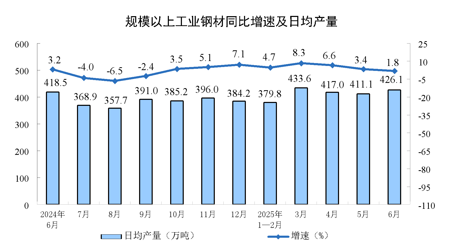 分产品看,6月份,规模以上工业623种产品中有379种产品产量同比增长。其中,钢材12784万吨,同比增长1.8%;水泥15547万吨,下降5.3%;十种有色金属695万吨,增长4.4%;乙烯285万吨,增长5.8%;汽车280.9万辆,增长8.8%,其中新能源汽车123.4万辆,增长18.8%;发电量7963亿千瓦时,增长1.7%;原油加工量6224万吨,增长8.5%。