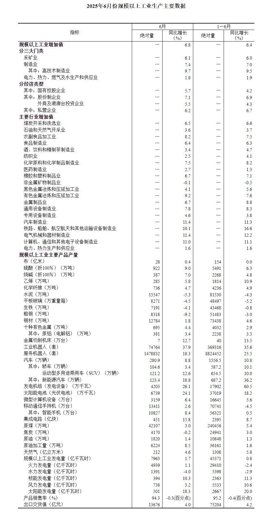 分三大门类看,6月份,采矿业增加值同比增长6.1%,制造业增长7.4%,电力、热力、燃气及水生产和供应业增长1.8%。