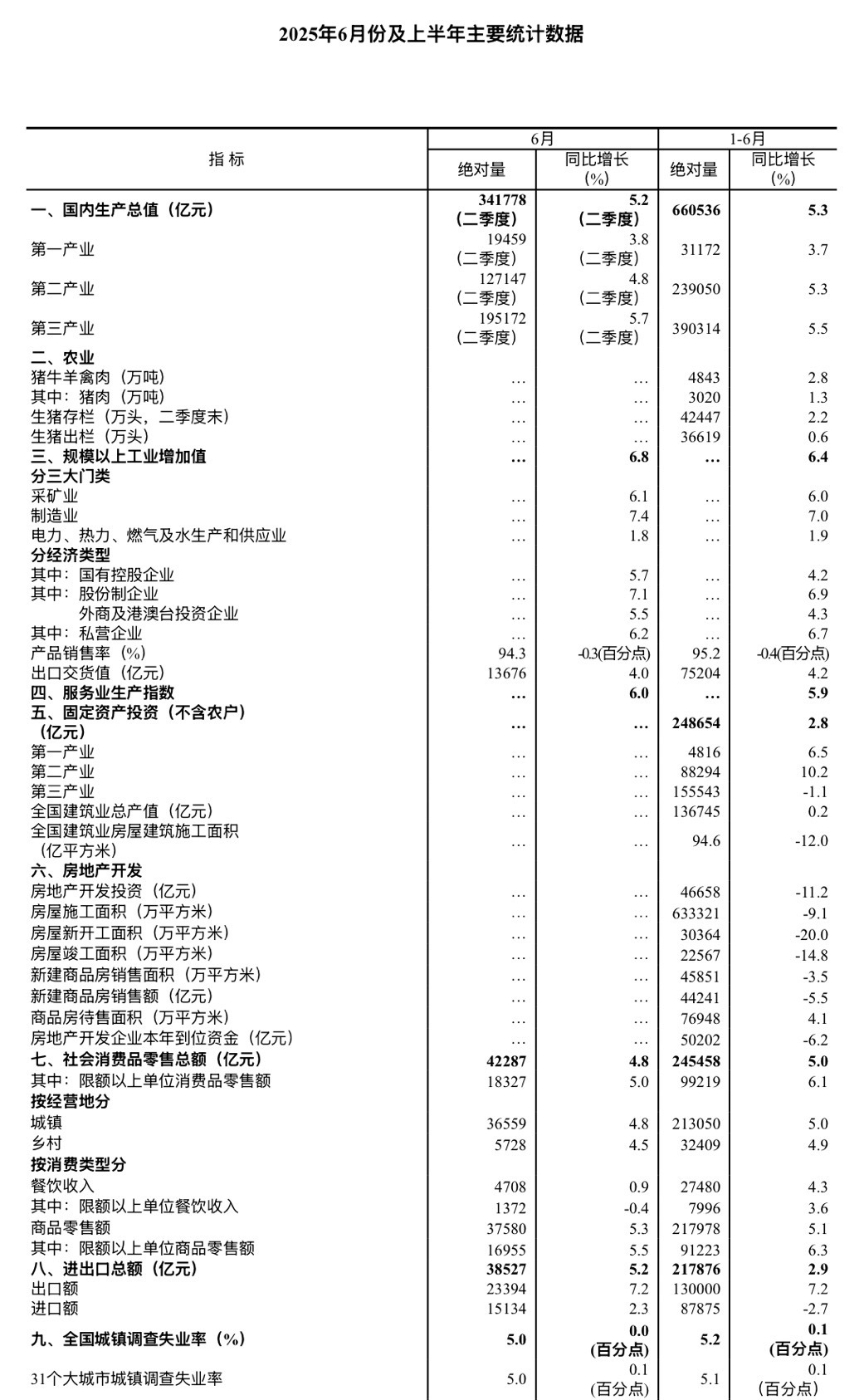 智通财经APP获悉,7月15日,据国家统计局,上半年,国民经济顶住压力、迎难而上,经济运行总体平稳、稳中向好,生产需求稳定增长,就业形势总体稳定,居民收入继续增加,新动能成长壮大,高质量发展取得新进展,社会大局保持稳定。初步核算,上半年国内生产总值660536亿元,按不变价格计算,同比增长5.3%。分产业看,第一产业增加值31172亿元,同比增长3.7%;第二产业增加值239050亿元,增长5.3%;第三产业增加值390314亿元,增长5.5%。