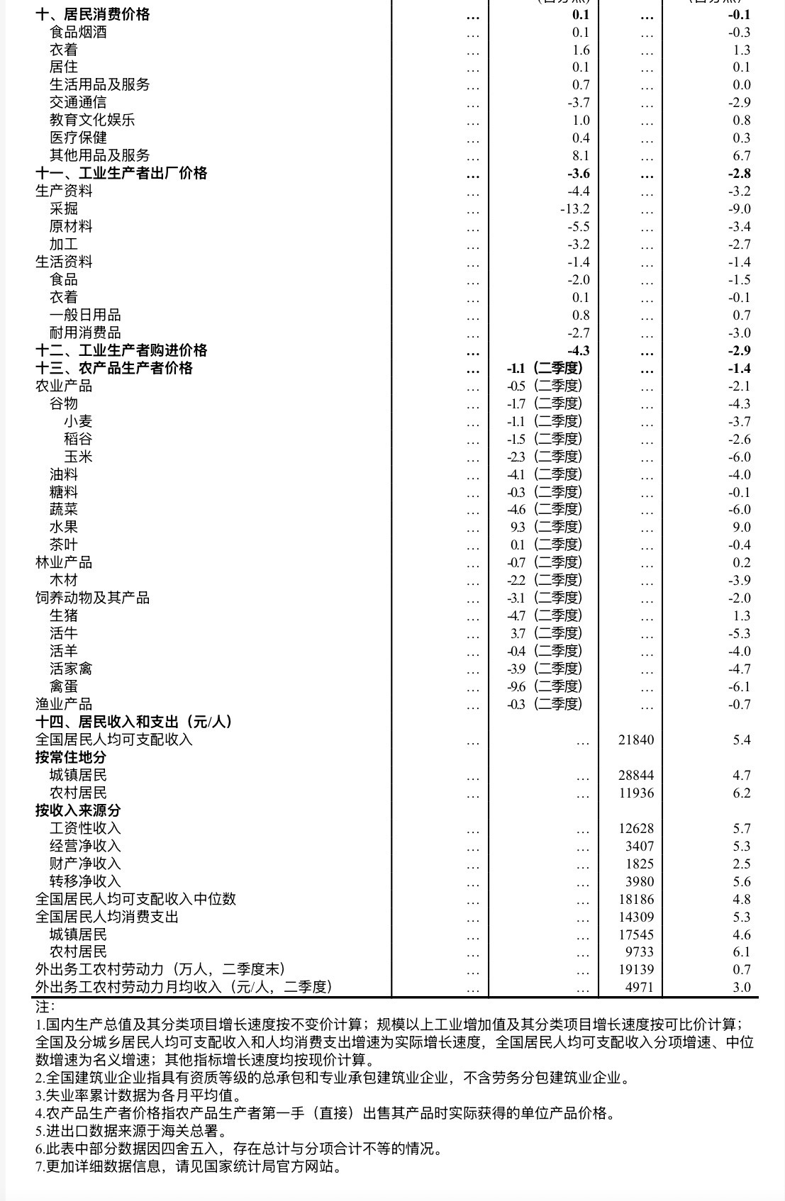上半年,全国居民人均可支配收入21840元,同比名义增长5.3%,扣除价格因素实际增长5.4%。按常住地分,城镇居民人均可支配收入28844元,同比名义增长4.7%,实际增长4.7%;农村居民人均可支配收入11936元,同比名义增长5.9%,实际增长6.2%。从收入来源看,全国居民人均工资性收入、经营净收入、财产净收入、转移净收入分别名义增长5.7%、5.3%、2.5%、5.6%。全国居民人均可支配收入中位数18186元,同比名义增长4.8%。
