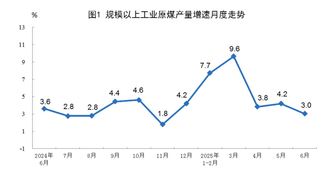 原煤生产平稳增长。6月份,规上工业原煤产量4.2亿吨,同比增长3.0%,增速比5月份放缓1.2个百分点;日均产量1404万吨。