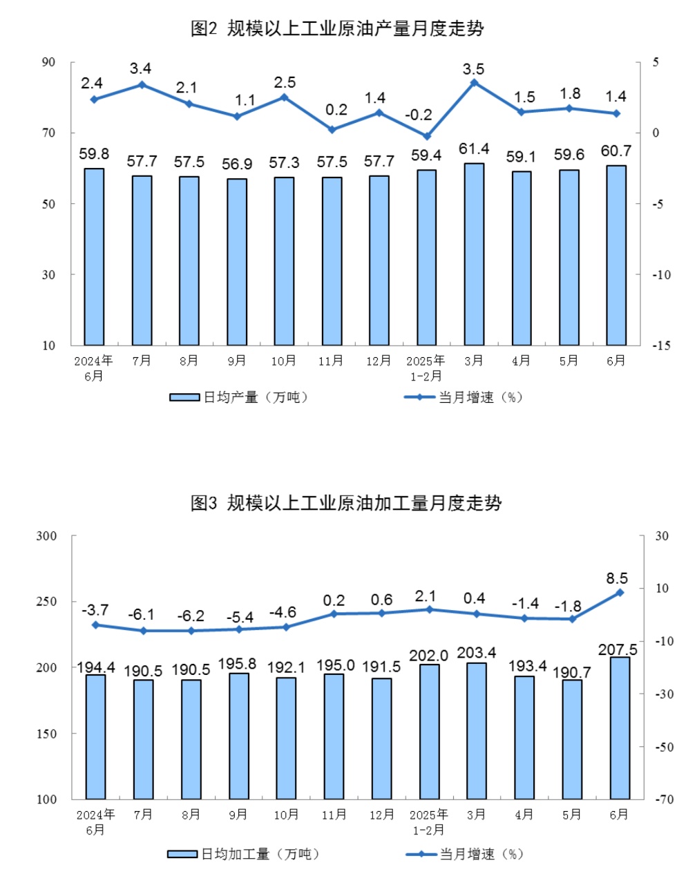 原油生产稳定增长。6月份,规上工业原油产量1820万吨,同比增长1.4%,增速比5月份放缓0.4个百分点;日均产量60.7万吨。