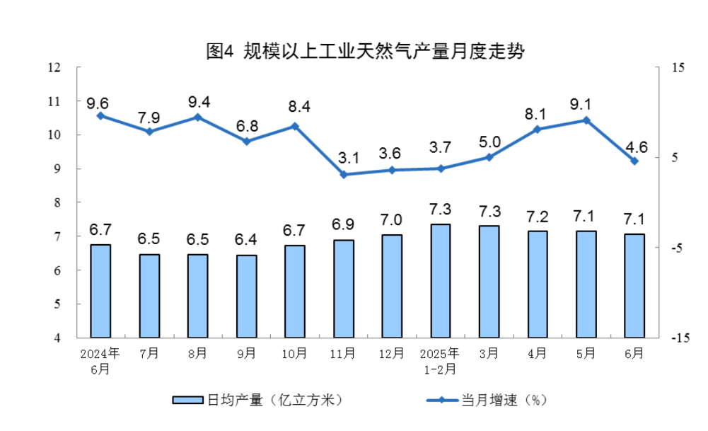 天然气生产稳定增长。6月份,规上工业天然气产量212亿立方米,同比增长4.6%,增速比5月份放缓4.5个百分点;日均产量7.1亿立方米。