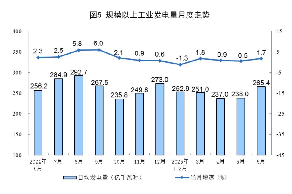 智通财经APP获悉,7月15日,据国家统计局,6月份,规模以上工业(以下简称规上工业)原煤、原油、天然气平稳增长,电力增速加快。6月份,规上工业发电量7963亿千瓦时,同比增长1.7%,增速比5月份加快1.2个百分点;日均发电265.4亿千瓦时。1—6月份,规上工业发电量45371亿千瓦时,同比增长0.8%,扣除天数原因,日均发电量同比增长1.3%。
