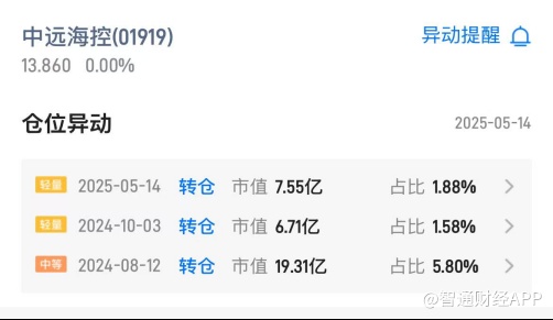 然而,与南向资金的积极“护盘”形成鲜明对比的是,空方力量也在暗流涌动。智通财经APP数据显示,2025年5月14日,中远海控出现市值高达7.55亿港元的转仓,占比1.88%。转出席位为港股通(沪),转入席位为香港上海汇丰银行。