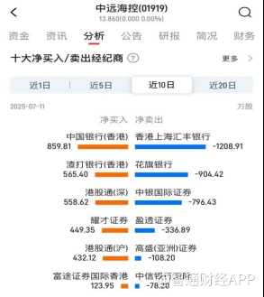 截至7月11日的近10个交易日,香港上海汇丰银行交易席位净卖出中远海控1208.91万股,位居净卖出榜首位。另外,花旗银行、中银国际证券席位分别净卖出904.42万股、796.43万股。