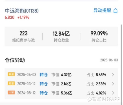 无独有偶,中远海能在6月3日发生市值4.37亿港元转仓,占比5.65%。转出席位为香港上海汇丰银行,转入席位为花旗银行。