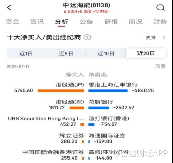 截至7月11日的近20个交易日,香港上海汇丰银行和花旗银行席位,分列中远海能净卖出榜前二,分别净卖出4840.25万股和2502.52万股。