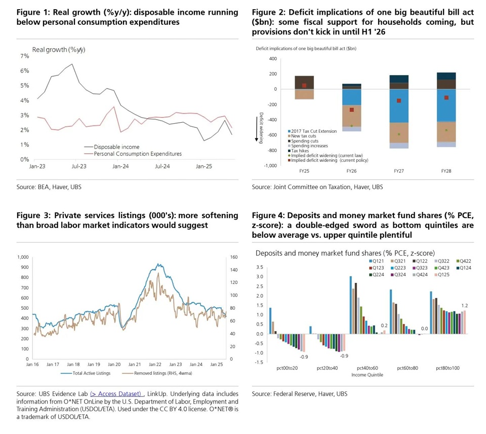 此外,瑞银全球股票策略团队表示,美国政府层面的财政刺激利好需要延迟到2026年才能陆续兑现,导致可支配收入增长跟不上消费增长。瑞银(UBS)因此下调2025年美国GDP增速预期至约1%。因此,由于高收入家庭仍有较强财务缓冲、就业韧性尚存等因素,美国消费长期结构性前景相对正面,真正的复苏动力或在2026年以后显现。