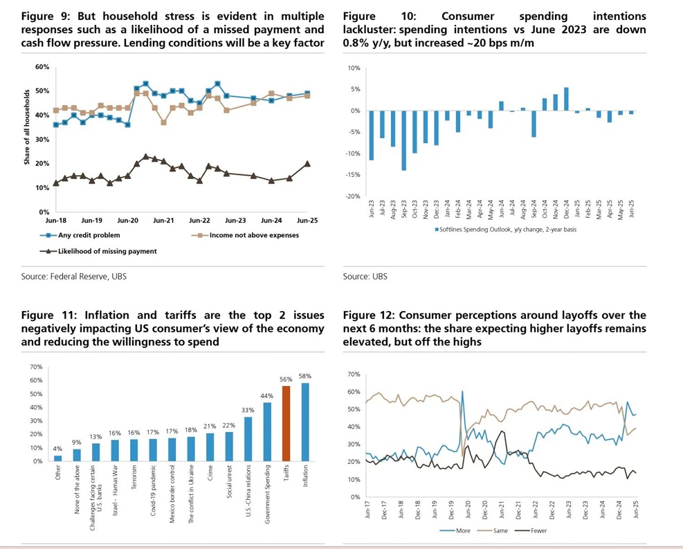 此外,特朗普贸易政策冲击可能进一步突显,美国政府在2025年下半年大幅上调并扩大了商品进口关税,加权平均关税税率可能骤升至约20%(而2024年仅约2%)。瑞银表示,覆盖多数国家的25%甚至以上的高关税将通过推高消费品价格直接侵蚀居民实际购买力。瑞银调查显示,高达68%的受访者认为通胀正在负面影响他们对经济的看法,42%的人则将关税视为主要拖累因素——特朗普关税政策这一单一因素的影响比例竟超过了对地缘政治局势或就业前景的担忧。