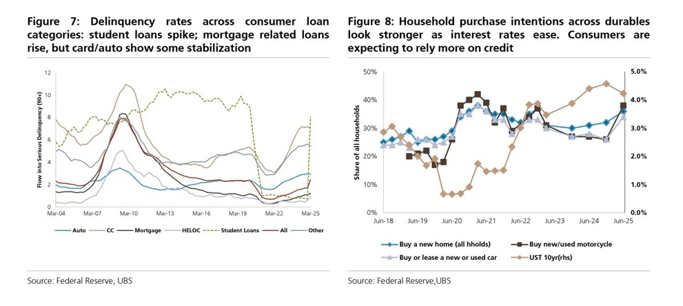 居民部门的信用压力也在上升。随着联邦学生贷款宽限期结束,美国学生贷款拖欠率显著跳升,房贷相关的违约率也从极低水平开始回升。相比之下,美国信用卡和汽车贷款违约率目前相对稳定,尚未出现新的飙升(表明这两类消费信贷的资产质量暂未明显恶化)。总体来看,消费者整体拖欠率呈上行趋势,但仍处于历史中等水平,需警惕其向其它信贷领域蔓延的“溢出效应”。瑞银将密切关注信用卡和汽车贷款的拖欠情况,作为判断消费者财务压力扩散的先行指标。