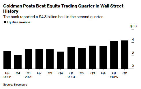 智通财经APP获悉,在美国政府贸易政策引发的市场波动助推下,高盛(GS.US)股票交易部门连续第二个季度刷新营收纪录,创下华尔街历史上最高的交易收入。