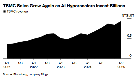 这家芯片制造巨头将今年美元计价的销售增长预期从原先的20%中段上调至约30%,同时预计第三季度营收将实现强劲增长,区间达318亿至330亿美元,较上年同期的235亿美元及上季度的300亿美元显著提升。这一上调进一步强化了从Meta(META.US)到谷歌(GOOGL.US)等科技巨头将持续投入数据中心建设以支持AI发展的市场预期。受此提振,纳斯达克指数期货应声上扬,台积电美股盘前涨超4%。