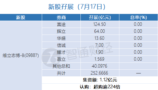 智通财经APP获悉,维立志博-B(09887)正在招股中。截止7月17日,富途、辉立、耀才等券商合计为维立志博借出252.6666亿港元,超购逾224倍。