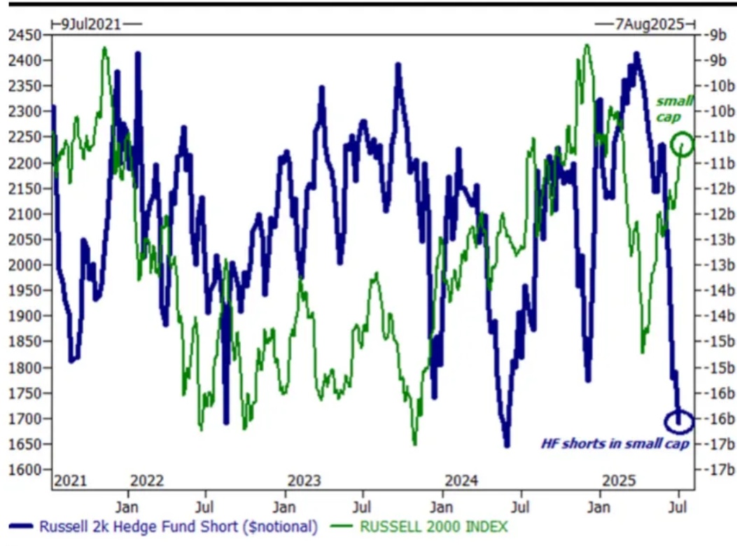智通财经APP获悉,在经历了自4月中旬年内最低点以来的一轮迅猛反弹后,随着全球贸易战阴影下美国经济韧性与通胀前景仍遭市场质疑,有着“聪明钱”称号的对冲基金巨头们正加码押注小型公司股票(即小盘股)价格下跌。特朗普致信各国的8月1日生效关税税率普遍大幅高于10%,推动美国通胀压力回升,以及美联储长期基准利率可能保持在更高水平,对冲基金机构普遍认为小盘股更容易受到美国国内经济不确定性的影响。