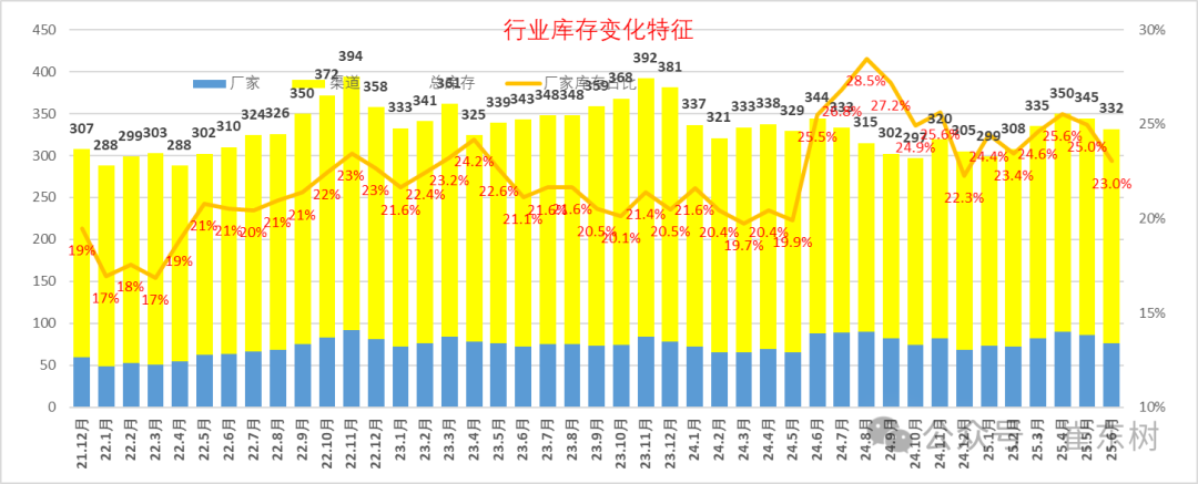 2024年整体库存保持相对平稳状态,12月回落在305万辆左右,2025年6月回升到332万辆,主要是渠道库存的回升,2025年6月的库存总体相对小幅增长。由于市场价格较好,厂商生产热情较高,总体行业库存压力相对可控。虽然厂家库存占比处于高位,但年后开始新车增量,前两年的去库存趋势缓解,库存在上半年小幅上升。