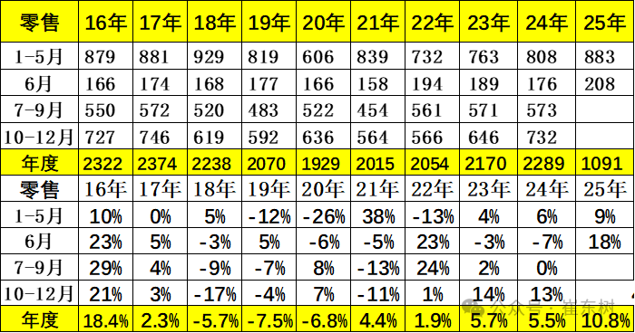 2025年6月全国乘用车市场零售208万辆,同比增长18%,环比增长7.5%。今年累计零售1091万辆,同比增长11%。前几年国内车市零售呈现“前低后高”的走势,今年实现了开局良好的走势。
