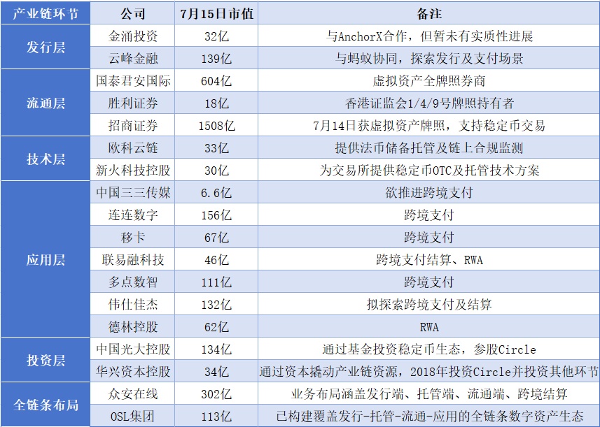 而投资层指的是企业通过资本投资了产业链企业,例如中国光大、华兴资本控股均投资了Circle,可享受Circle估值增长红利。此外华兴资本控股还在交易平台、RWA技术方等环节亦有相应投资布局,通过资本撬动产业资源。