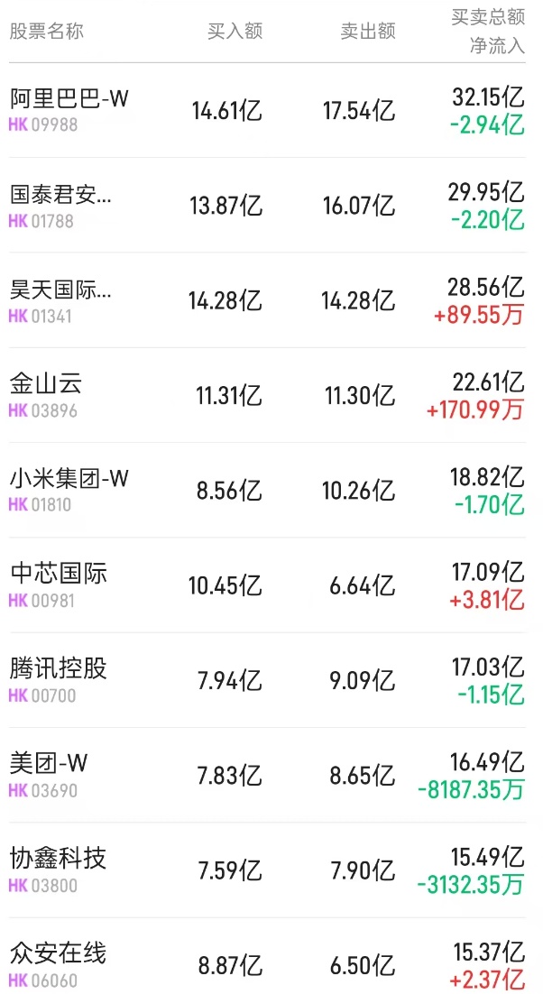 此外,美团-W(03690)再获净买入2.02亿港元,而小米集团-W(01810)、昊天国际建设(01341)分别遭净卖出2.99亿、4486万港元。