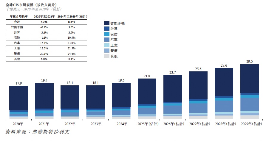 就拿CIS来说,根据弗若斯特沙利文的资料,全球CIS市场将由2020年的179亿美元增加到2024年的195亿美元,期间对应年复合增长率为2.2%。而在新技术催化等多因素共同作用下,预计该市场在2029年将达到295亿美元,未来几年的年复合增长率将达到8.6%,潜在增速显著高于前几年。