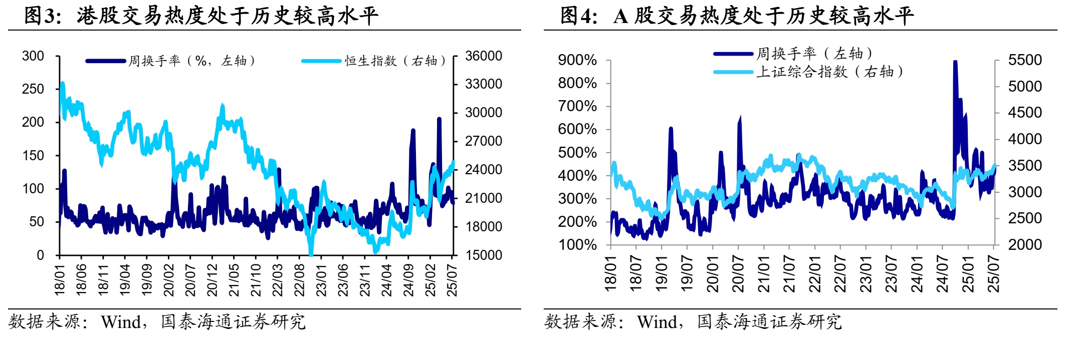 港股整体热度处于历史中位,略低于A股。首先看市场整体热度情况,从估值和交易指标等来看,当前港股处历史中位水平,并且略低于A股。截至25/07/18(下同),估值角度,恒生指数PE(TTM)/PB(LF)分别为11.0倍/1.16倍,分别处05年以来由低到高54%/36%的历史分位水平;恒生科技 PE(TTM)为20.8倍,处有数据以来15%分位;万得全A PE(TTM)/PB(LF)分别为20.4倍/1.68倍,处05年以来65%/28%分位。交易指标角度,港股和A股市场活跃度处于历史高位水平,恒生指数周换手率(年化)为81%,处05年以来由低到高83%分位;万得全A周换手率(年化)达414%,处76%分位。