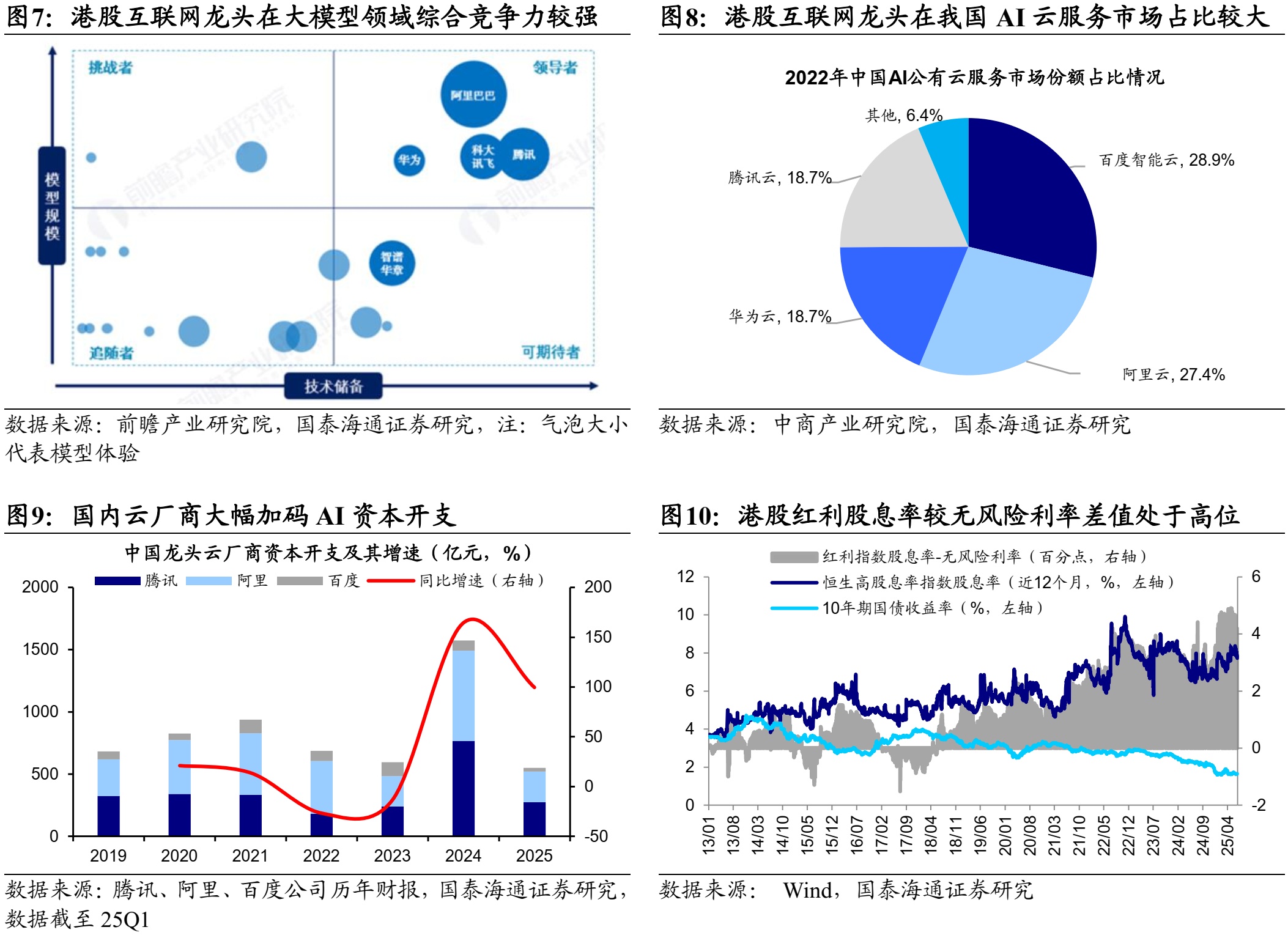 港股互联网AI资本开支或再上新台阶,大模型迭代与AI应用落地进度有望提速。今年以来,受美国算力芯片出口管制影响,国内互联网巨头资本开支不及预期,对港股科技行情形成压制。6月以来中美经贸关系边际缓和,美国对华科技产品出口的管制政策也有所松动。我们预计下半年港股互联网巨头或将加大AI基础设施领域的资本投入,大模型迭代与AI应用落地进度有望提速。结合上文所述,港股科技板块整体估值不高,交易热度也回落至合理水平。随着本轮AI浪潮的产业周期向上趋势进一步确认,有望推动相关的港股科技龙头重新跑赢市场。