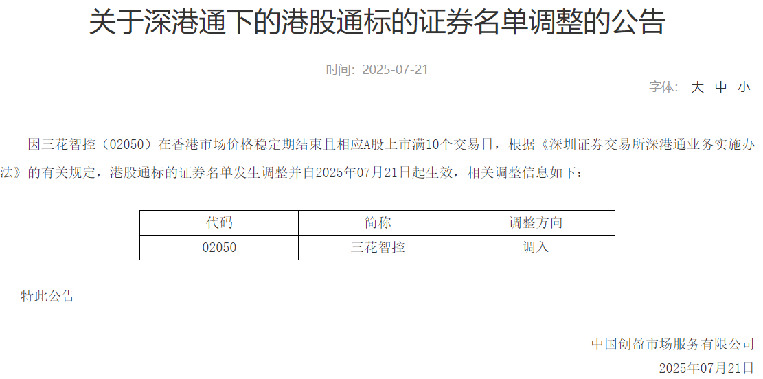 智通财经APP获悉,深交所发布公告称,因三花智控(02050)在香港市场价格稳定期结束且相应A股上市满10个交易日,根据《深圳证券交易所深港通业务实施办法》的有关规定,港股通标的证券名单发生调整并自2025年07月21日起生效,调入三花智控。