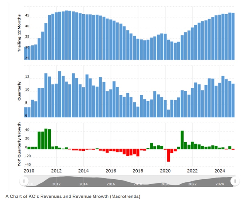 自2022年3月以来,可口可乐季度营收增长率持续下滑,年度营收增速已连续三年放缓。2022年底至今,公司营收仅从430亿美元增至470亿美元。过去三年每股收益增长同样乏力,尽管期间斥资近50亿美元回购股票,但12个月滚动每股收益仅从2022年3月的2.37美元微增至目前的2.49美元。