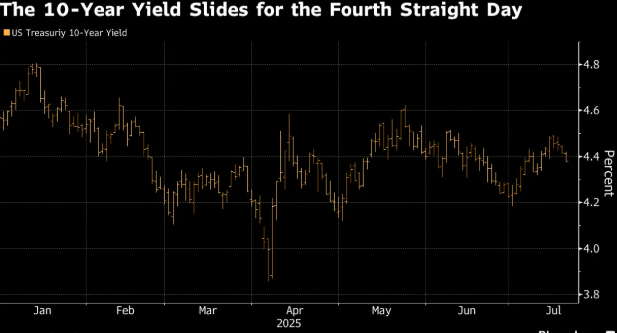 智通财经APP获悉,因为美国关税政策的最后期限临近,投资者对避险资产的需求增加,美国国债价格上扬,与欧洲公债价格的上涨走势一致,美国10 年期国债收益率下降了 4 个基点,至 4.38%,为 7 月 11 日以来的最低水平。本周,美国和欧盟的官员仍将进行贸易谈判,迄今为止尚未取得突破,这增加了 30%关税可能在下个月初生效的风险。