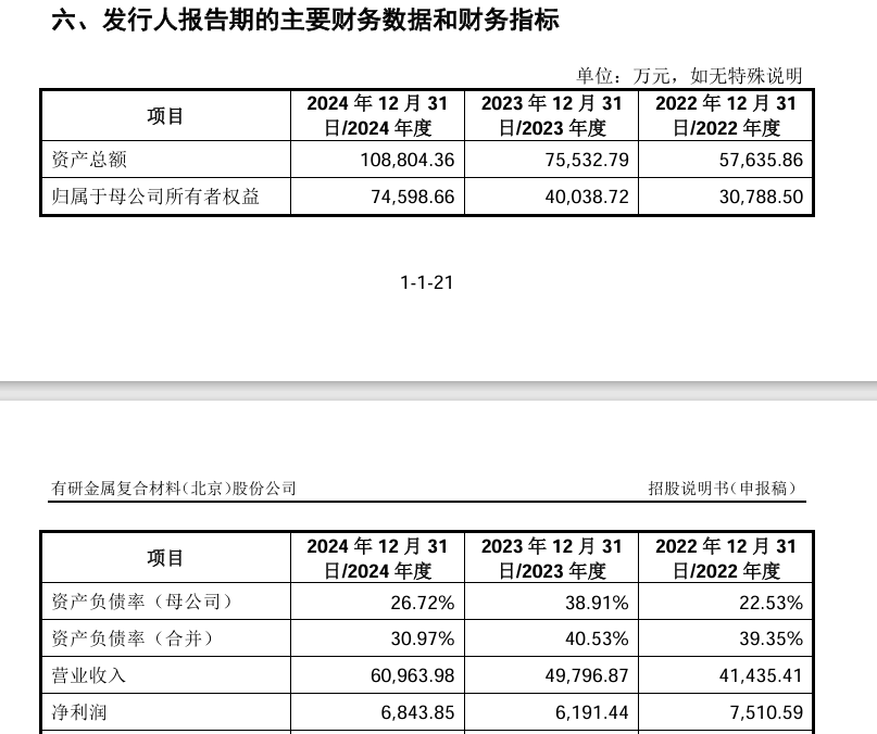 财务方面,于2022年度、2023年度及2024年度,有研复材营业收入分别约为4.14亿元、4.98亿元及6.1亿元人民币;同期,公司实现净利润分别约为7510.59万元、6191.44万元及6843.85万元人民币。