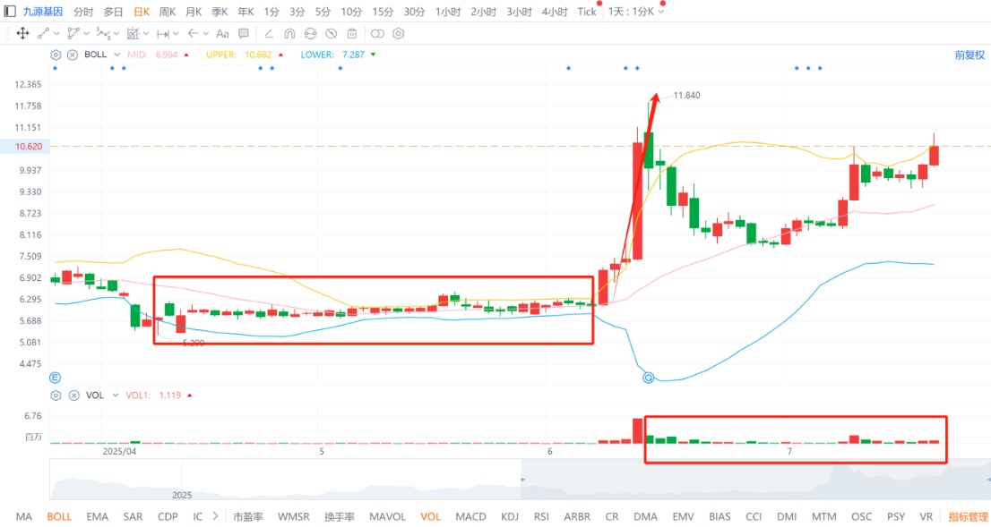 从这段时间的量能情况不难看出,九源基因此前的资金仍在场内未出局,当不坚定的获利盘都离场后,便会开始新一轮的拉升以实现快速赢利。7月2日,当九源基因股价在上个交易日跌破BOLL线中轨后便开启了第二波上升行情。