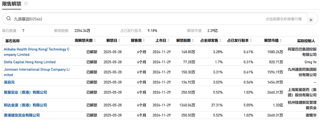 在今年4月和5月,港市共计11家公司的基石解禁,其中4月份有4家,5月份有7家,而九源基因便是其中之一。