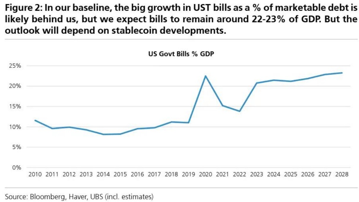 智通财经APP获悉,瑞银此前预计短期美债占可流通债务比重的快速扩张阶段已经过去。然而,《GENIUS 法案》可能带来新一轮增长。