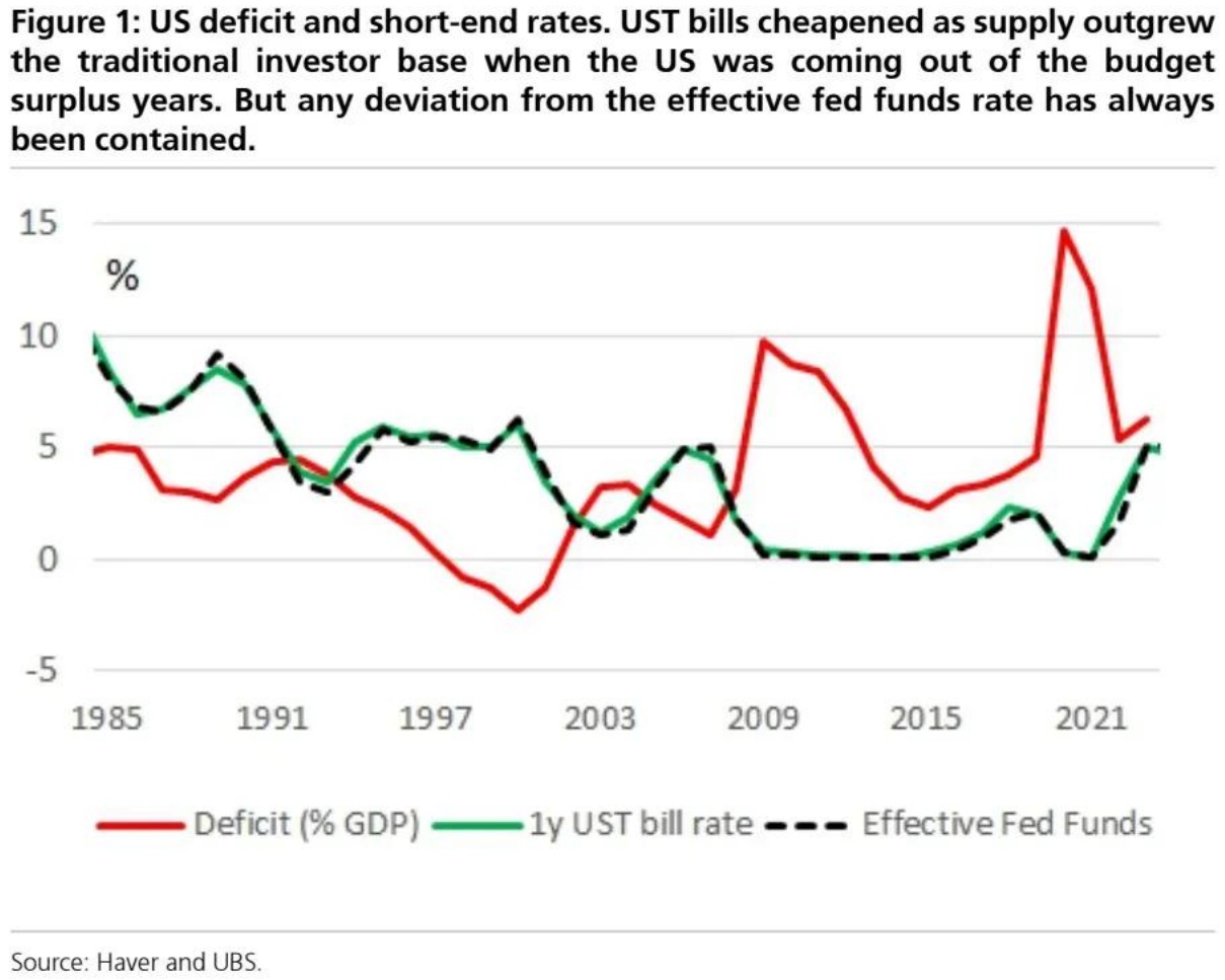 瑞银在先前报告中曾指出,上世纪 90 年代末美国摆脱财政盈余时期,短期国债供给增速超过传统投资者基础,导致其相对便宜。不过,短期国债利率与有效联邦基金利率的任何偏离始终有限。