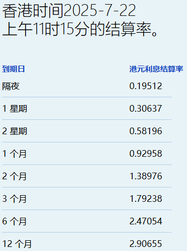 智通财经APP获悉,7月22日,港元拆息普遍向上,与楼按相关的一个月拆息终止两连跌,报0.92958%,是7月18日后最高,升1.922基点;反映银行资金成本的三个月拆息报1.79238%,跌3.982基点,是7月4日后最低。