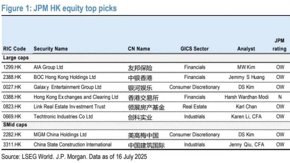 智通财经APP获悉,摩根大通发布研报称,将2025年底恒生指数的基准/乐观/悲观目标上调至13,000/14,000/11,000港元,对应回报率分别为2%/10%/-14%。首选股包括友邦保险(01299)、中银香港(02388)、银河娱乐(00027)、香港交易所(00388)、领展房产基金(00823)和创科实业(00669)。港股上半年表现强劲,2025年上半年创纪录的股票回报率和融资活动迎来了温和的经济扩张和EPS上调。主题选股机会重点关注稳定币牌照发放、香港北部都会区发展以及本地高股息股在低收益率环境下的吸引力。