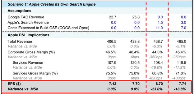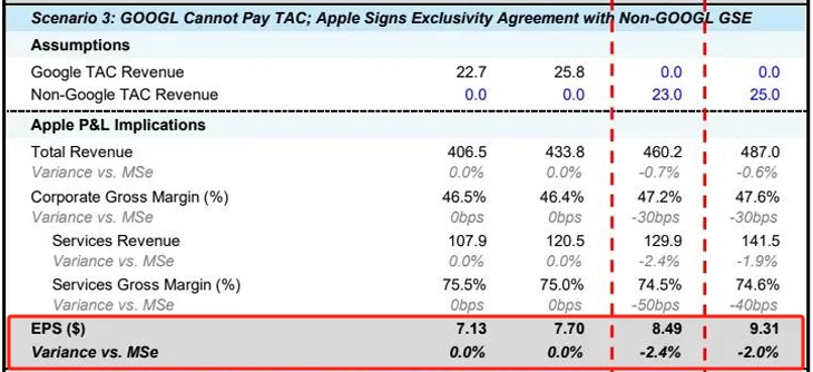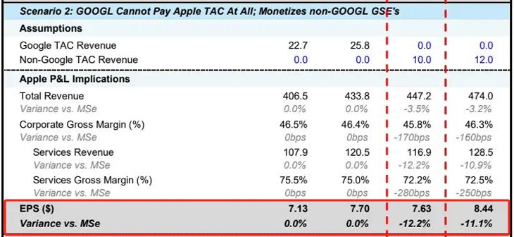 美国司法部最严厉补救措施获得通过,谷歌无法向苹果支付费用,苹果只能通过其他搜索引擎(传统和AI驱动)变现。在此情景中,大摩估计苹果每年流量获取成本(TAC)收入将下降60%以上,因为其他非谷歌搜索引擎的变现能力远不如谷歌,这将导致苹果2027财年EPS下滑12%。