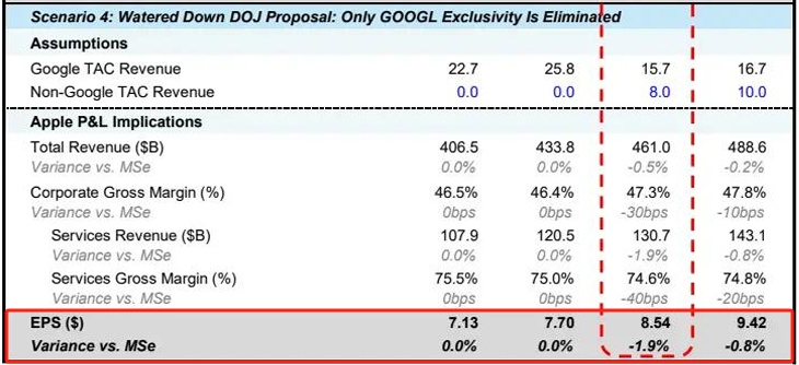 大摩认为,这是最可能发生的情形——即谷歌将不再被允许为获取苹果平台上的默认搜索地位支付费用,但仍可在苹果平台变现,同时苹果也能通过“选项屏幕(choice screen)”和TAC支付机制从其他搜索引擎变现。在这种情形下,大摩预计,苹果2027财年EPS下行仅约2%,且对用户体验几乎没有影响。考虑到苹果已在欧盟推出“选项屏幕”,且尚未观察到其对服务收入增长产生负面影响,大摩认为这个2%的EPS下行预估可能仍偏保守,这种情形对苹果的财务影响极可能非常有限。
