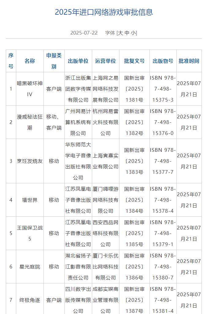 智通财经APP获悉,7月22日,国家新闻出版署公布2025年7月份进口网络游戏审批信息,7月共7款游戏获批。其中包括《暗黑破坏神 IV 》、《漫威秘法狂潮》、《烹饪发烧友》等。