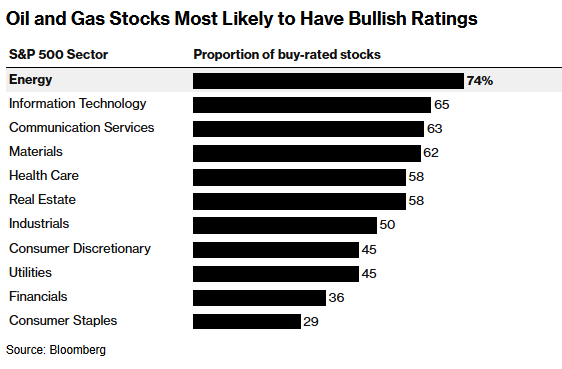 智通财经APP获悉,华尔街分析师对石油和天然气股票寄予厚望,较低的估值以及特朗普对陷入困境能源行业的大力支持都让他们备受鼓舞。在标普500指数涵盖的11个行业中,能源板块获得“买入”评级的股票占比最高。彭博汇编的数据显示,该板块约四分之三的成分股获得“买入”推荐,而整体市场中这一比例约为一半。此外,卖方分析师预计,未来12个月能源股将上涨约16%,涨幅仅次于医疗板块,约为整体指数预期涨幅的两倍。