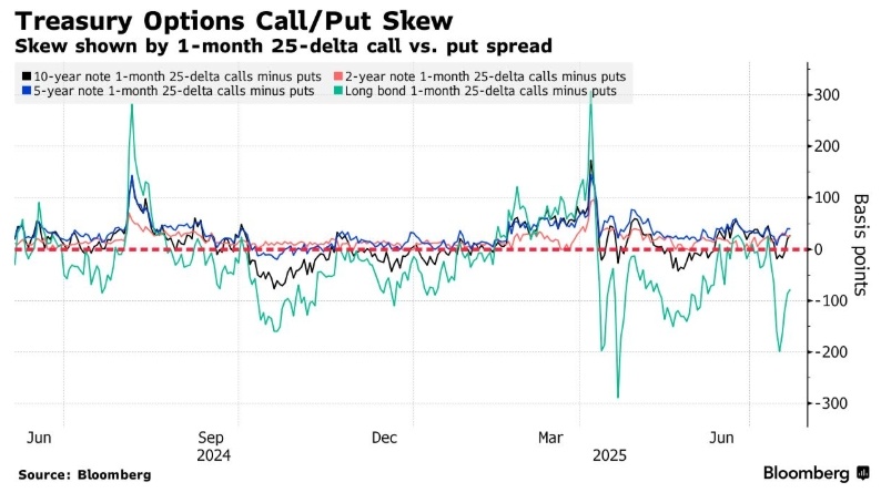 在利率回落的背景下,30年期美债看跌期权的风险溢价有所下降。此前市场对于收益率上行的担忧导致对看跌期权的强烈偏好,造成期权“倾斜率”达到过去一年罕见的极端水平。而随着收益率降至7月22日的4.9%左右,这一倾斜现象开始缓解,表明投资者对进一步大幅下跌的担忧减轻。