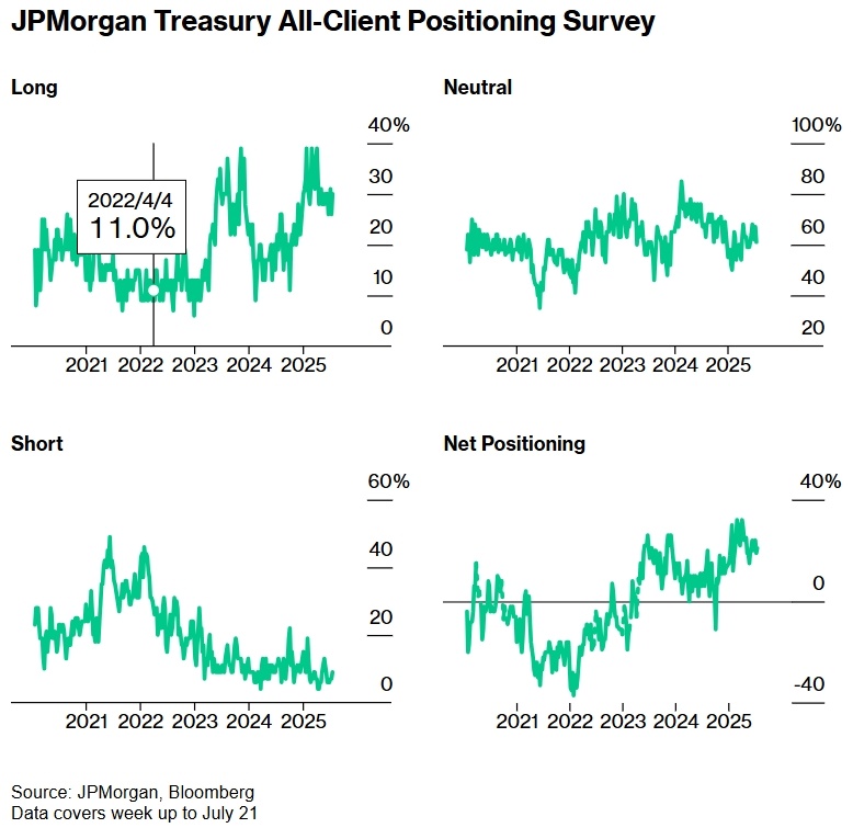 摩根大通客户调查指出,截至7月21日的一周内,该行客户对美国国债的多头和空头头寸均有所增加,而保持中性头寸的比例下降,显示出市场立场更加分化。整体净多头仓位略有下降。