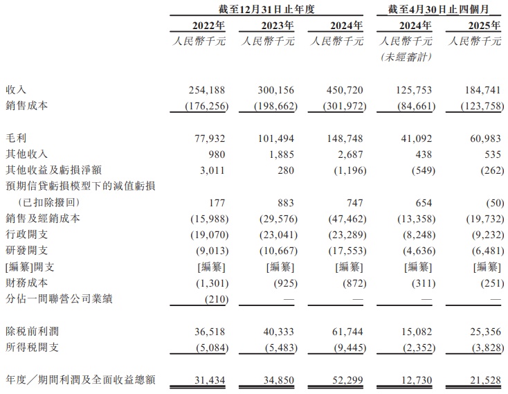 财务方面,于2022年度、2023年度、2024年度及2025年截至4月30日止四个月,该公司实现收入分别约为2.54亿元、3亿元、4.51亿元、1.85亿元人民币;同期,年度利润及全面收益总额分别为3143.4万元、3485万元、5229.9万元、2152.8万元人民币。