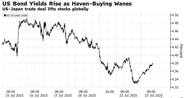 智通财经APP获悉,周三,美国国债结束了连续五天的上涨态势,因为随着美国与日本达成贸易协议,避险需求有所减弱。美国 10 年期国债的收益率上升了 3 个基点,至 4.38%,结束了长达一周的下降趋势。德国10年期国债收益率走高 3 个基点至 2.62%;而英国在发售 15 年期债券之后,英国10年期国债债券的收益率则上涨 5 个基点至 4.62%。
