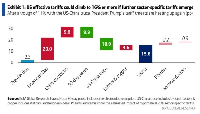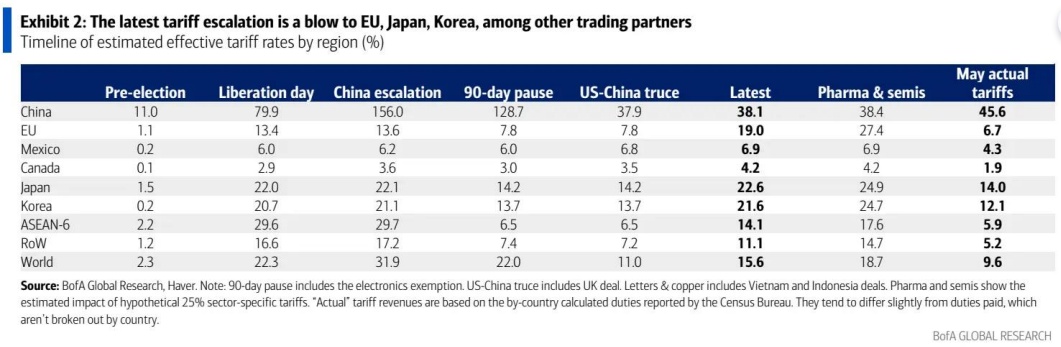 7月22日,美银发布研究报告指出,美国最新的关税公告可能使有效税率提高约5个百分点。根据过去12个月的进口构成,美银估计有效税率将升至近16%(图表1)。