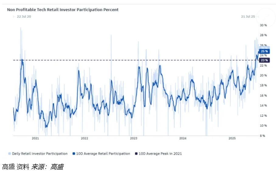 一个TikTok博主的推荐可能瞬间带动十万级投资者跟风。"Citadel证券数据显示,散户已连续19个交易日净买入现金股票,创2021年模因股热潮以来最长纪录,高盛追踪的散户参与率10日均值更升至25%的历史高位。