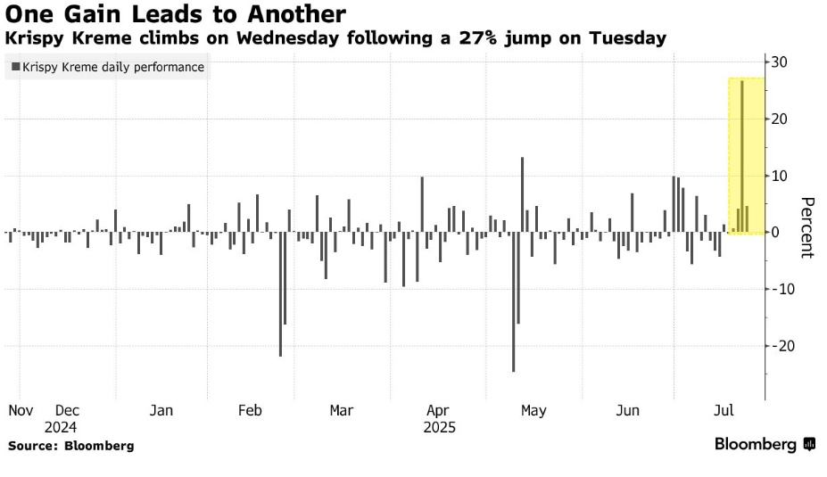甜甜圈制造商Krispy Kreme(DNUT.US)周三盘中更是一度飙升35%,尽管最终收窄至4.6%涨幅,但本周整体涨幅仍达38%,看涨期权交易量突破100万份历史高位。值得注意的是,该公司近期因暂停季度股息和终止与麦当劳合作导致股价承压,30%的流通股被卖空的背景为其提供了轧空基础。