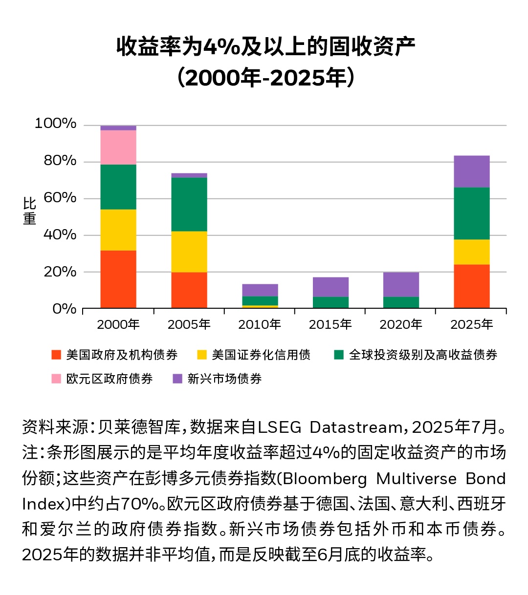 智通财经APP获悉,7月4日,贝莱德智库发文称,全球金融危机后,各国央行大幅下调利率至接近零甚至负值水平,并购买债券,导致债券收益率持续下滑。在这一市场环境下,投资者很难获得收益,除非承担长期债券的投资风险。但如今的情况已截然不同,如下图所示,当前利率已稳定在新冠疫情前的水平之上,全球约80%的固收资产收益率超过4%。这使得信用债、抵押贷款证券和新兴市场债券等资产变得更具吸引力。